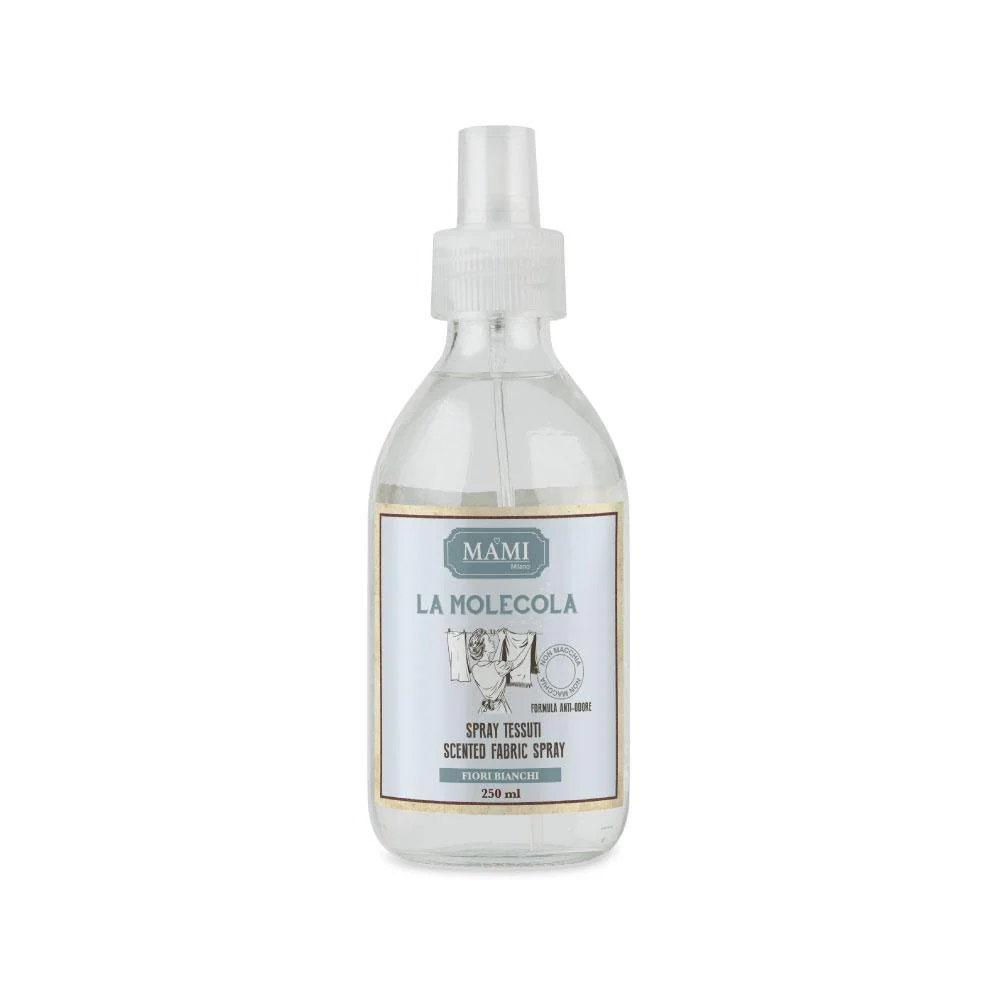 La Molecola Spray Tessuti – Fiori bianchi 250 ml MAMI Milano. Grazie alla sua speciale molecola, neutralizza i cattivi odori degli indumenti lasciando una piacevole e delicata nota di freschezza che dura nel tempo. Si utilizza direttamente sui tessuti (anche quelli delicati come la seta e il cachemire) non lascia traccia, non macchia e non li altera. Le note fruttate di questa morbida profumazione si combinano alla perfezione con le note floreali di Mughetto, Caprifoglio e Rosa Taif. Un fondo di Note Legnose e Spezie calde conclude questa composizione straordinaria.